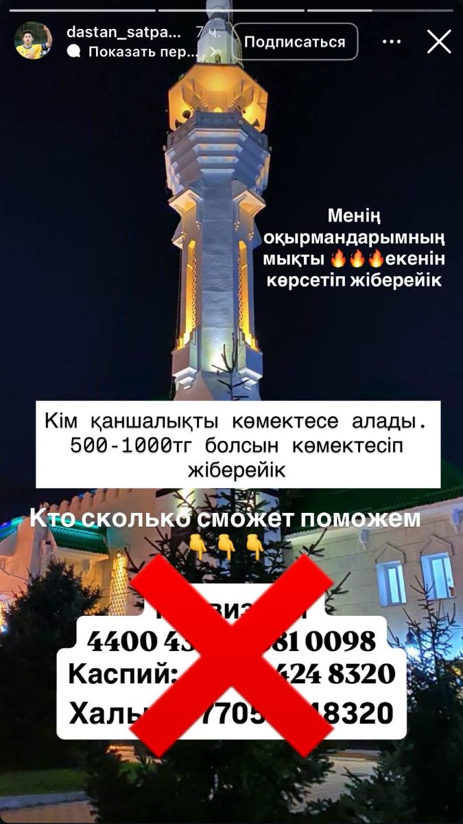 На днях владелец этого аккаунта опубликовал номер банковского счёта и попросил подписчиков перевести ему деньги. Многие люди, переживающие за Дастана Сатпаева, могли поверить, что сам спортсмен нуждается в средствах и обращается к ним за помощью.