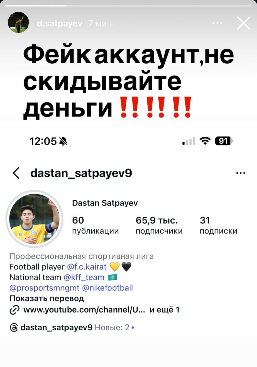 В связи с этим Дастан Сатпаев, футболист «Кайрата» и сборной Казахстана, был вынужден обратиться к общественности. Он написал, что этот аккаунт фейковый и не стоит никуда никому отправлять деньги. Спортсмен предупредил фанатов о мошенничестве.
