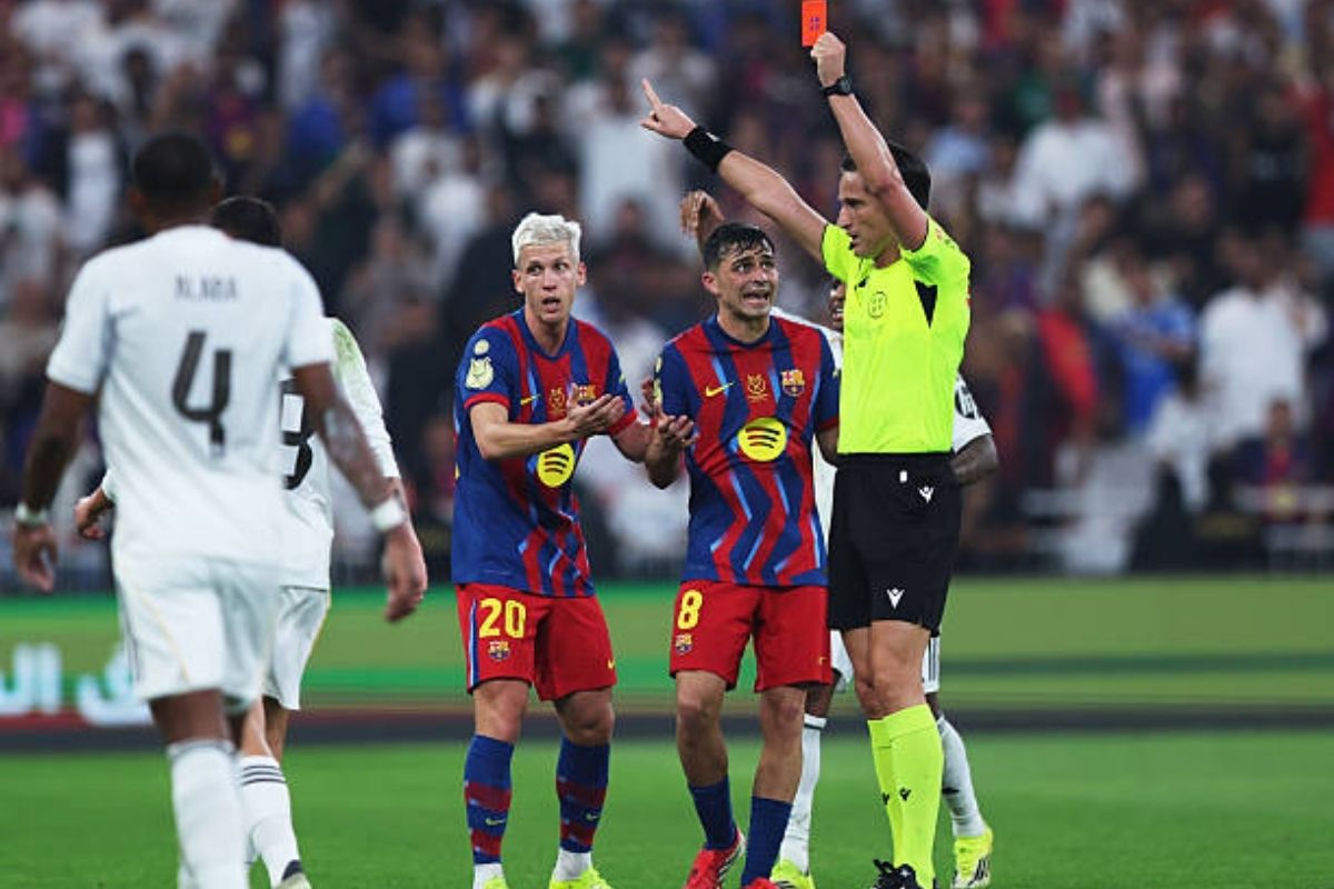 На 90-й минуте Хаби Алонсо бросил в бой недолеченного Килиана Мбаппе. Француз сразу создал остроту, вынудив Френки де Йонга пойти на грубый фол, за который голландец получил прямую красную карточку. Последние 5 минут стали настоящим адом для «Барселоны»: