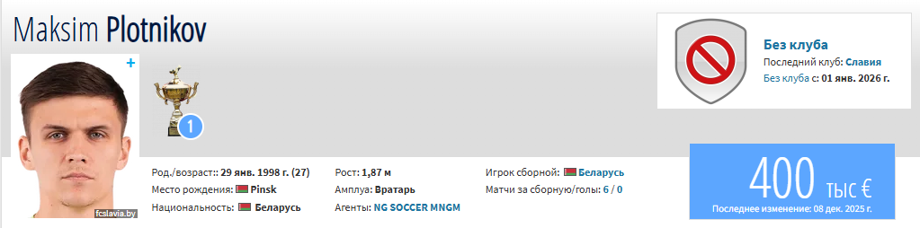 По информации AmanVibe, 27-летний белорусский вратарь Максим Плотников согласовал условия контракта и официально присоединился к столичному «Женису». Голкипер стал очередным новичком в составе команды, возглавляемой Али Алиевым.