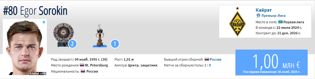 По данным портала Тransfermarkt, стоимость трансфера Сорокина оценивается в 1 млн евро, или более 595 млн тенге.