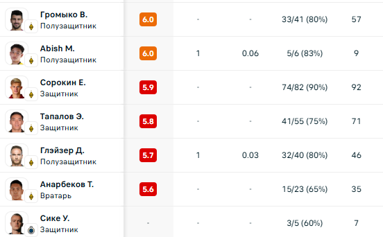 Лучшие результаты среди игроков «Кайрата» у Садыбекова – 7,5 и Мранского – 6,6.