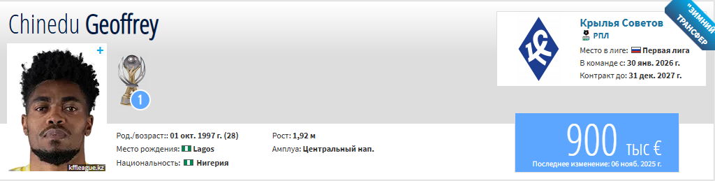 Нигерийский нападающий продолжит карьеру в российской Премьер-лиге, подписав контракт с самарскими «Крыльями Советов» до конца 2027 года.