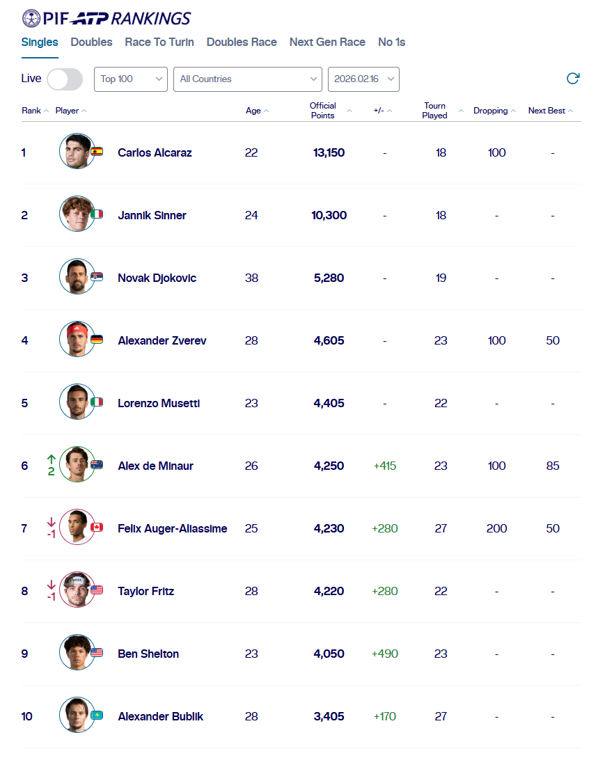 Лидером мирового рейтинга остаётся испанец Карлос Алькарас, на втором месте итальянец Янник Синнер, а тройку замыкает серб Новак Джокович.