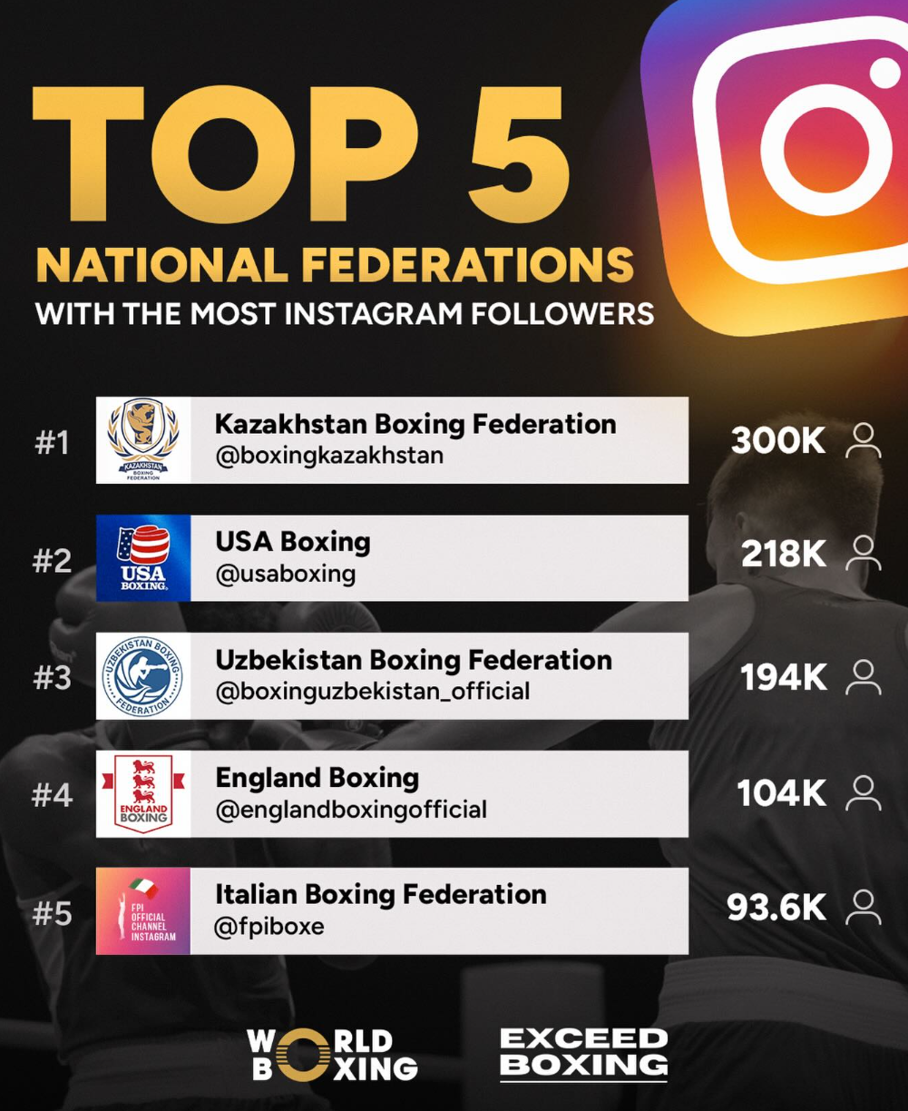 Согласно рейтингу, опубликованному worldboxing, аккаунт Федерации бокса Казахстана в Instagram boxingkazakhstan занял первое место в мире по общему числу подписчиков среди всех национальных федераций.