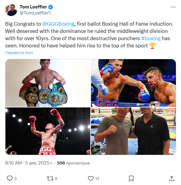 «Большие поздравления Геннадию Головкину, включенному в Зал славы бокса с первой попытки. Это вполне заслуженно, учитывая доминирование, с которым он правил в среднем весе более 10 лет. Один из самых разрушительных панчеров, которых видел бокс. Для меня честь, что я помог ему подняться на вершину этого спорта», – написал Том Леффлер в своей социальной сети X.