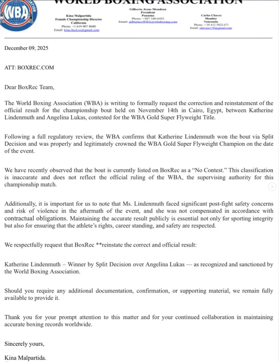 «После полной проверки со стороны регулирующих органов WBA подтверждает, что Кэтрин Линденмут выиграла бой раздельным решением и была должным образом и законно названа чемпионом WBA-Gold. Недавно мы заметили, что этот бой в настоящее время указан на BoxRec как "Без проведения соревнований". Эта классификация неточна и не отражает официального решения WBA, органа, осуществляющего надзор за этим чемпионским поединком», – говорится в письме.