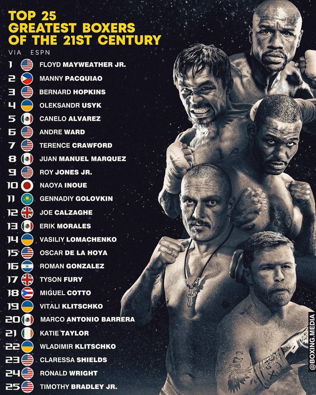 Список лучших боксеров XXI века по версии Boxing.media возглавил мериканец Флойд Мэйвезер. Второе место занял филиппинец Мэнни Пакьяо, третье – американец Бернард Хопкинс.
