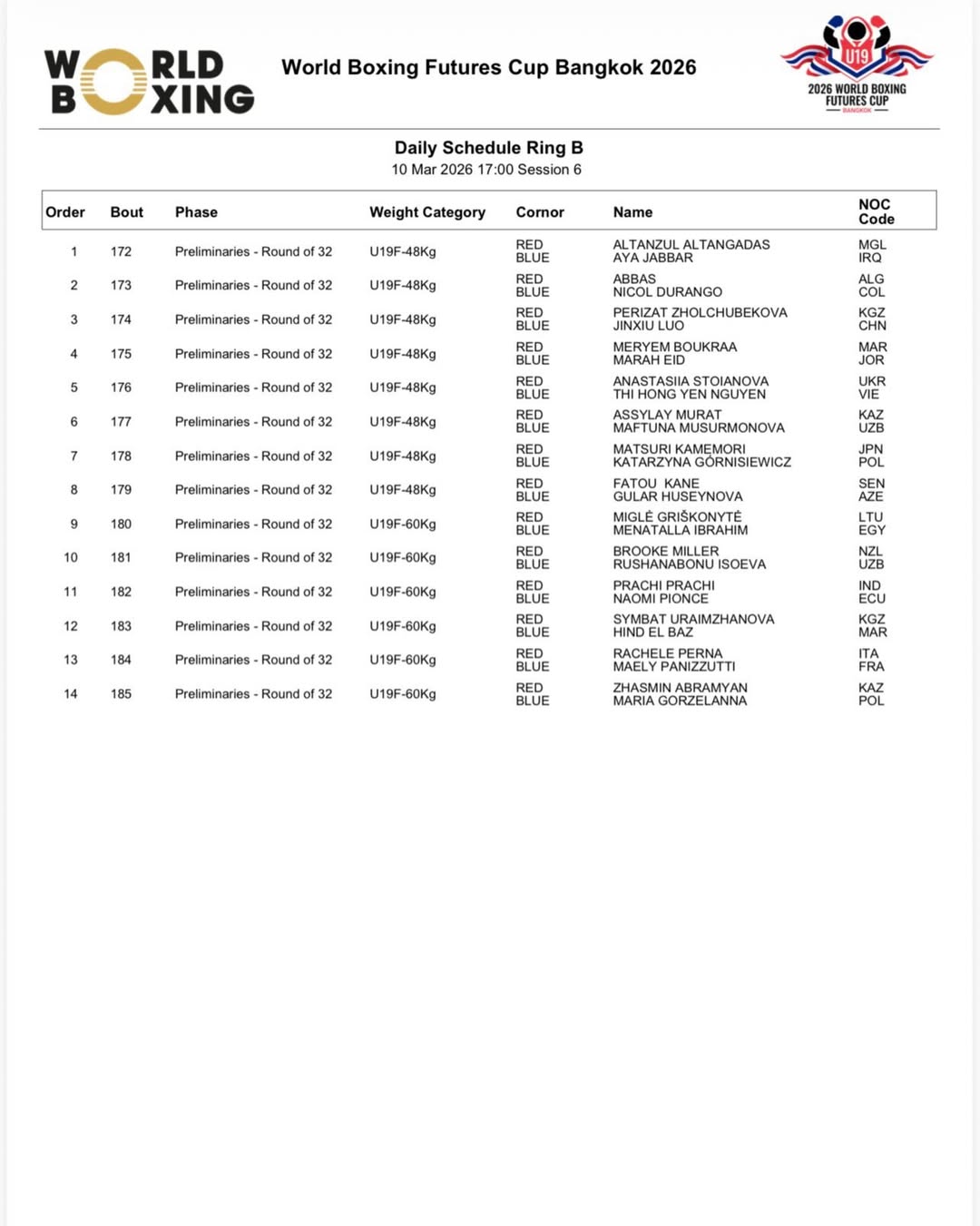 В 1/16 финала весовой категории до 48 килограммов казахстанка Асылай Мурат встретится с Мафтуной Мусурмоновой из Узбекистана.