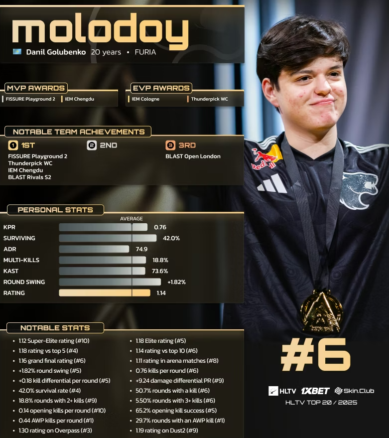 Данил molodoy Голубенко совершил один из самых стремительных прорывов в истории Counter-Strike. По итогам 2025 года он занял 20-е место в рейтинге HLTV, став первым представителем своей страны, добившимся такого признания в дебютный же год на тир-1 уровне.