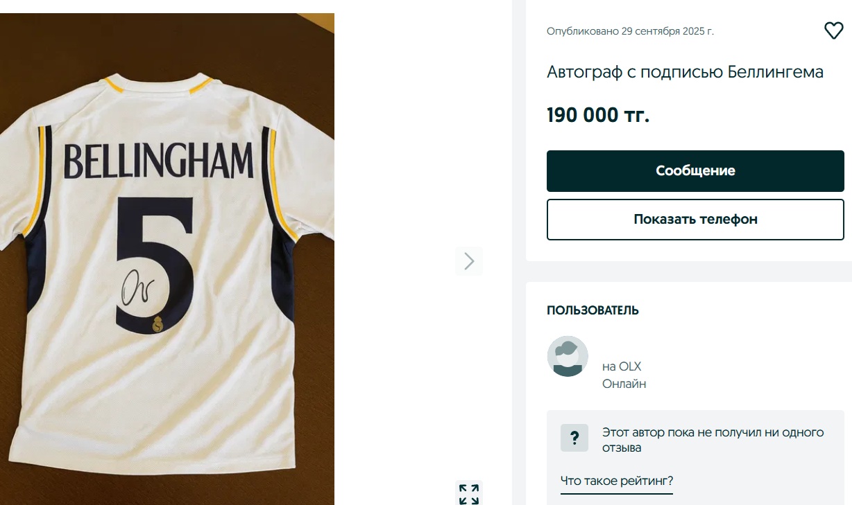 Так, на популярном онлайн-ресурсе OLX появилось объявление о продаже футболки с подписью Джуда Беллингема. Стоимость лота – 190 тысяч тенге. Автор утверждает, что в наличии есть также автограф Вальверде.