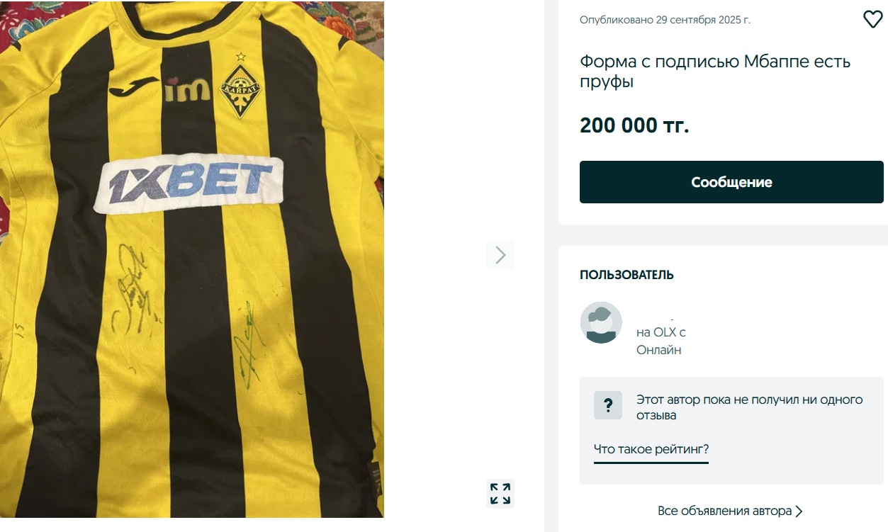 Автор лота утверждает, что “торг имеется”. А вот футболку “Кайрата” с подписью Килиана Мбаппе оценили в 200 тысяч тенге. Продавец уверяет, что автографи от звезды “Реала” он “получил в отеле, пруфы имеются и торг возможен”.