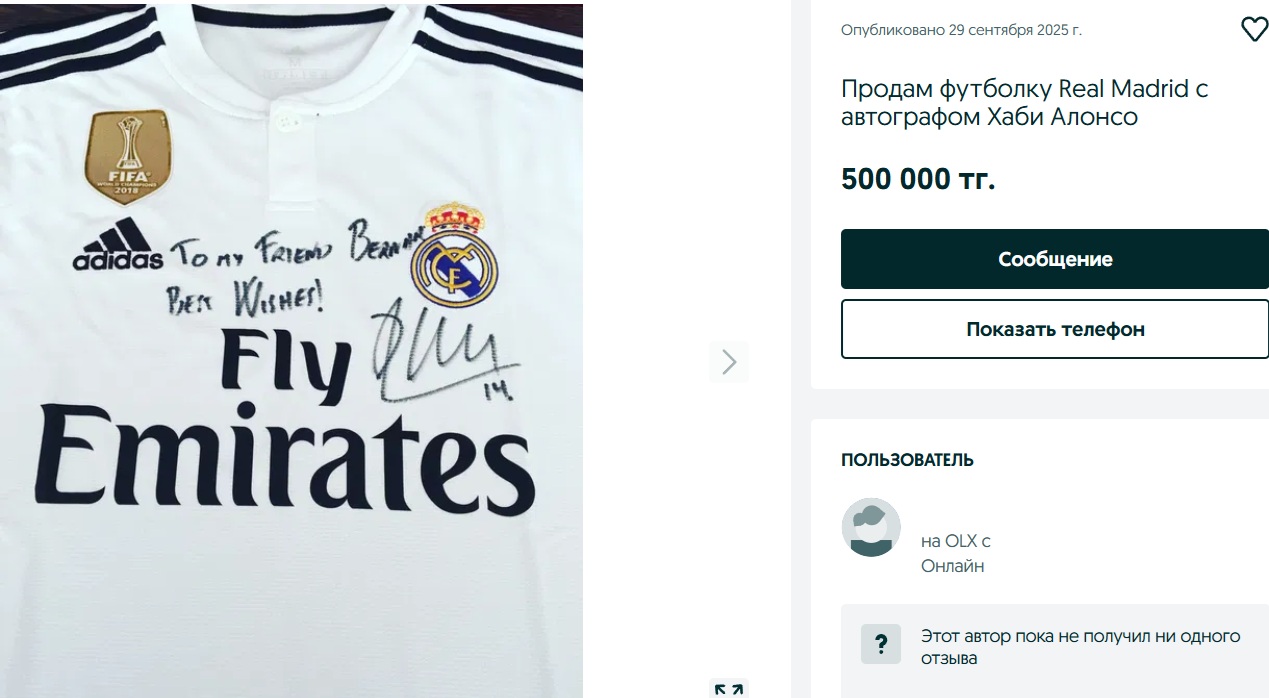 И самый дорогой лот, который нам удалось найти в Сети, – футболка “Реала” с автографом Хаби Алонсо. За нее просят 500 тысяч тенге. Автор объявления утверждает, что игровая форма была куплена в официальном магазине “королевского” клуба в Мадриде в 2018 году.