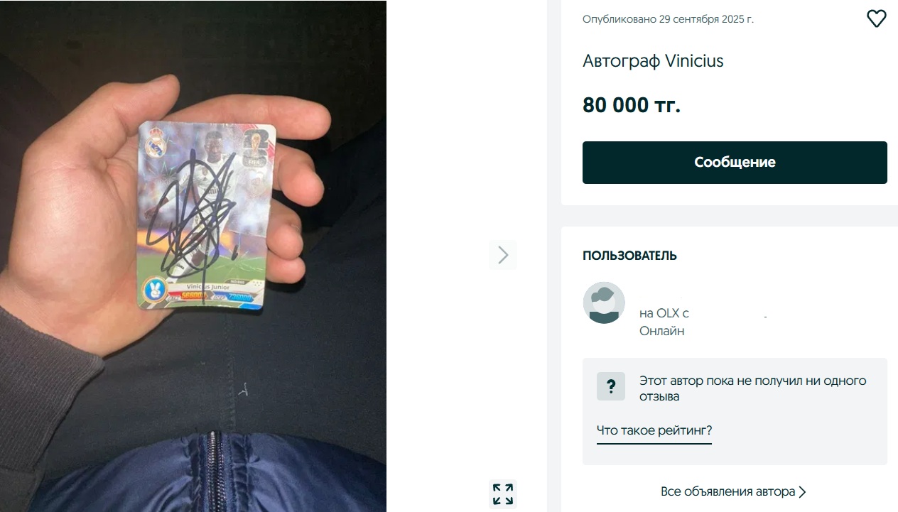 Карточку с подписью Винисиуса продают за 80 тысяч тенге.
