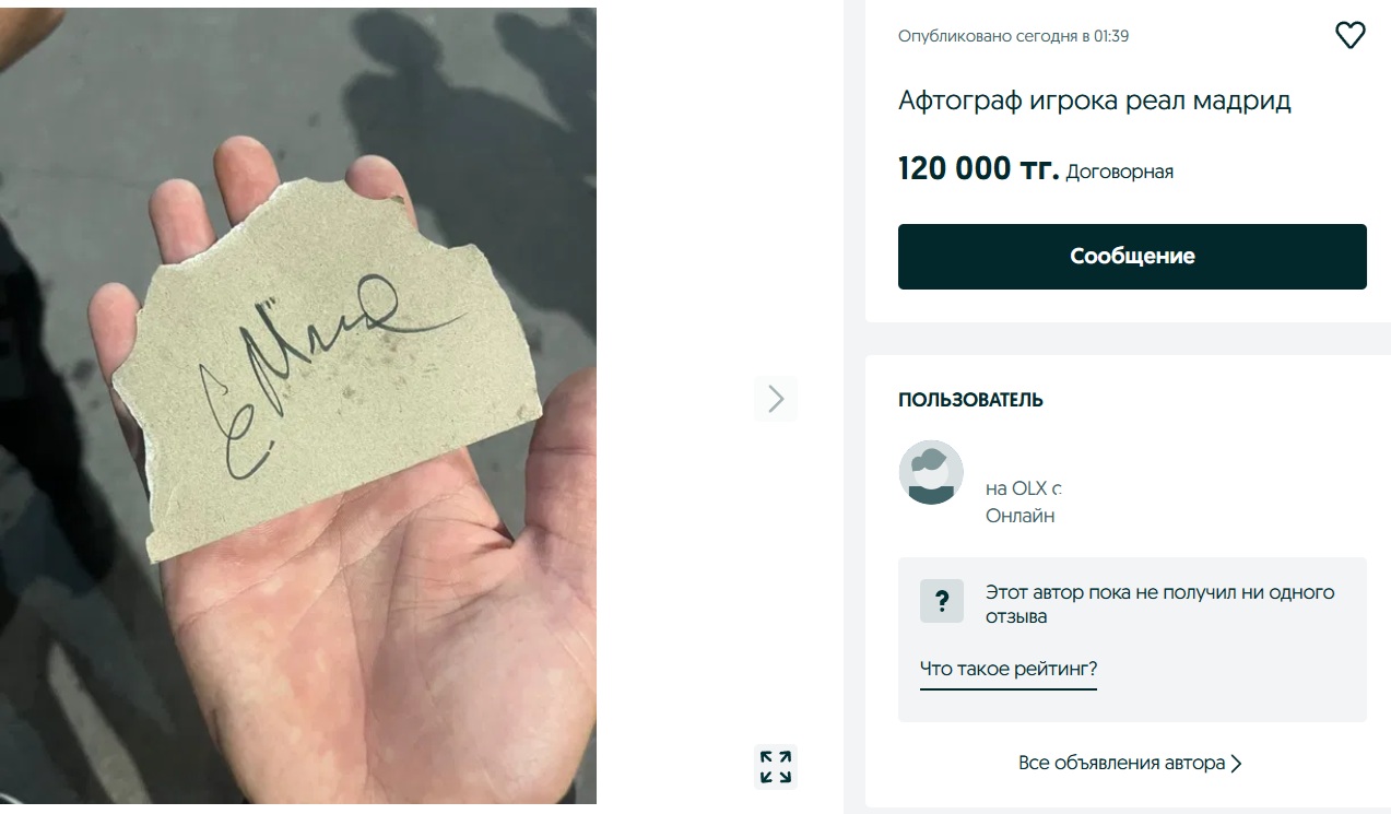 “Автограф игрока “Реала”, точно не знаю, чья роспись. Либо Эндрика либо Милитао. По цене можно договориться”, – пишет продавец.