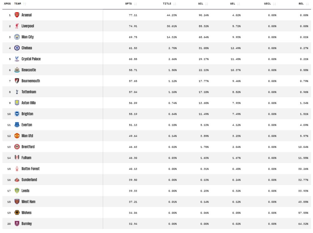 Лондонский «Арсенал» возглавил этот рейтинг, став главным фаворитом на чемпионский титул. Вероятность успеха «канониров» составляет 44,2%.