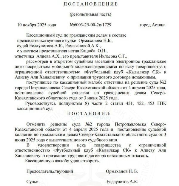 «Отменить решение суда №2 города Петропавловска Северо-Казахстанской области от 4 апреля 2025 года и постановление судебной коллегии от 3 июня 2025 года. Иск товарищества с ограниченной ответственностью „Футбольный клуб „Кызылжар СК“ к Алиеву Али Ханалиевичу о признании трудового договора незаконным – отклонить».