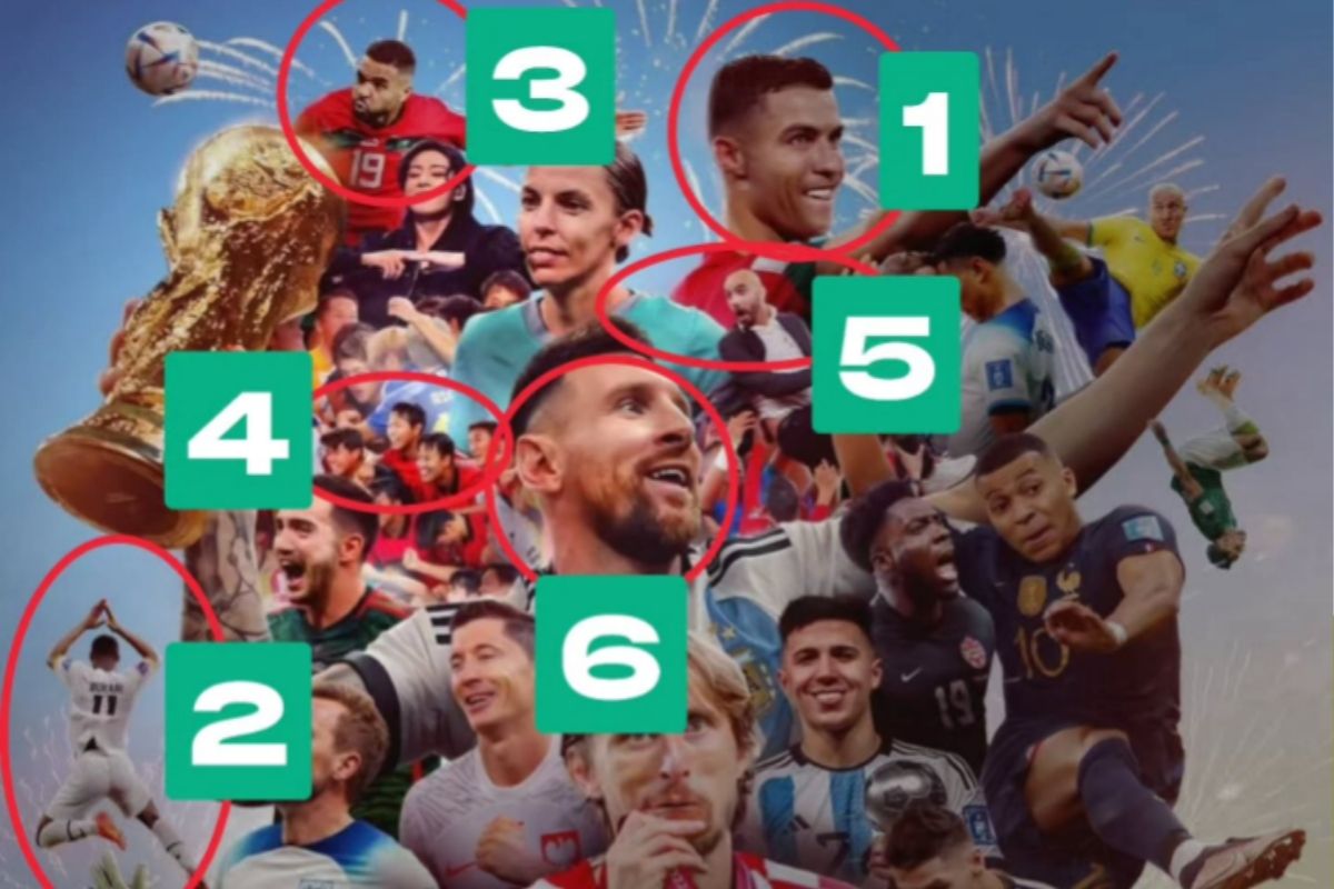В центре композиции, доминируя над всем коллажем, расположен Лионель Месси с Кубком мира.