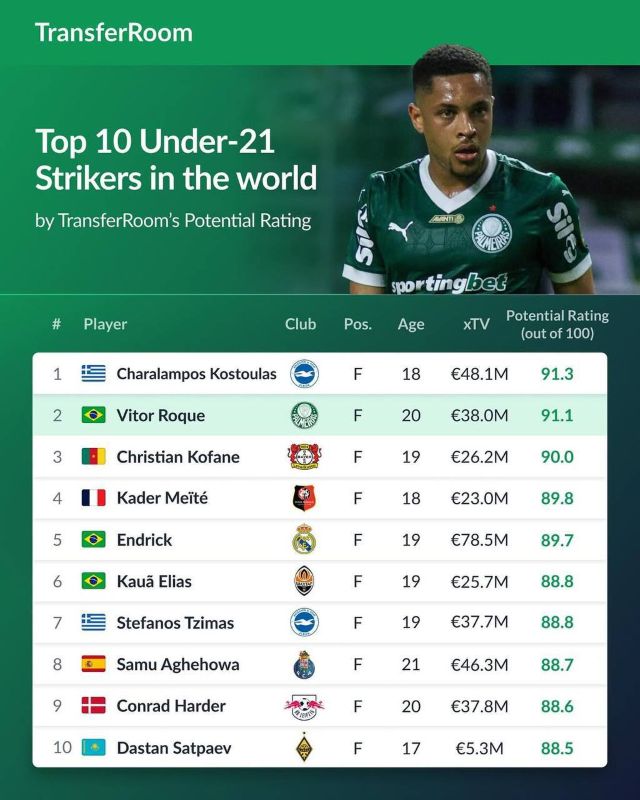 Среди других перспективных имен, вошедших в рейтинг, числятся Эндрик, Витор Роке, Штефанос Дзимас и Кауан Элиас.