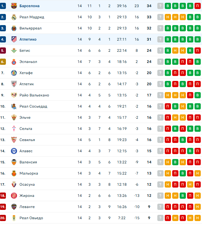 Ситуация в таблице Ла Лиги достигла максимального накала. Разница между 1-м и 4-м местом составляет всего 3 очка. Любая осечка лидера может стоить ему первого места.
