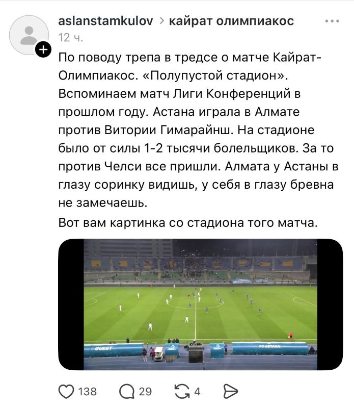 «Вспоминаем матч Лиги Конференций в прошлом году. Астана играла в Алмате против Витории Гимарайнш. На стадионе было от силы 1-2 тысячи болельщиков. За то против Челси все пришли. Алмата у Астаны в глазу соринку видишь, у себя в глазу бревна не замечаешь».