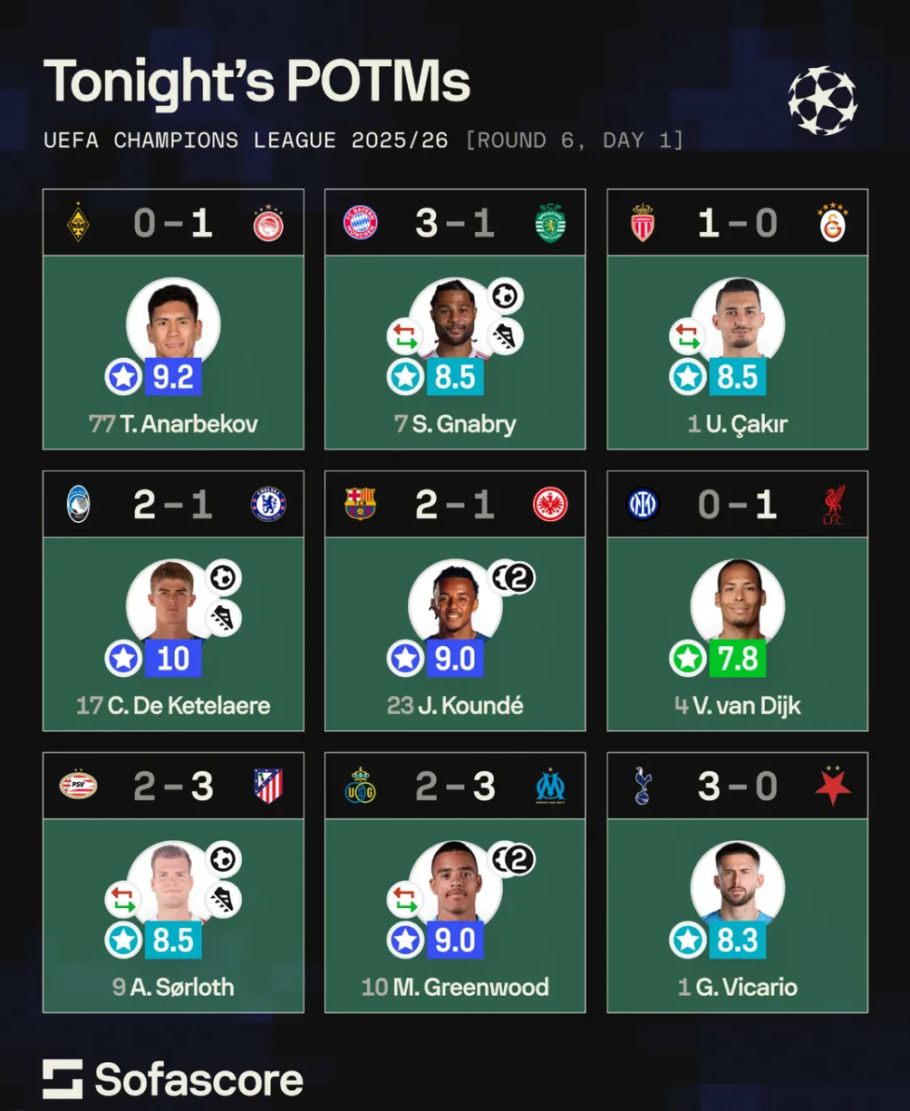 Казахстанский вратарь получил 9.2 балла по данным портала SofaScore. Это лучшая оценка среди всех игроков текущего тура Лиги чемпионов. Уровень Анарбекова превзошел показатели таких звезд, как Жюль Кунде (9.0), Серж Гнабри (8.5) и даже Вирджил ван Дейк (7.8). По итогам матча Темирлан Анарбеков был официально признан лучшим игроком встречи.