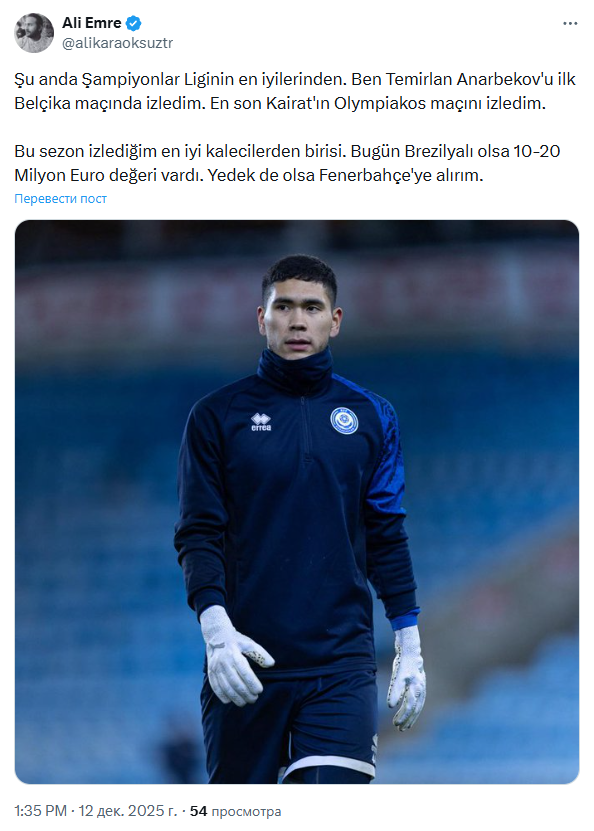 В своем аккаунте в соцсети X Али Эмре заявил, что 20-летний казахстанский голкипер производит сильнейшее впечатление: