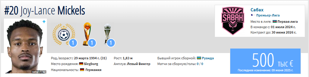Как сообщает Asnews, информация о возможном трансфере немецкого нападающего азербайджанского «Сабаха» Джой-Ланса Миккельса в один из клубов казахстанской Премьер-лиги не подтвердилась. Несмотря на слухи в средствах массовой информации, 31-летний воспитанник менхенгладбахской «Боруссии» не ведет переговоры с командами из Казахстана.