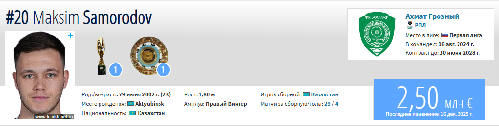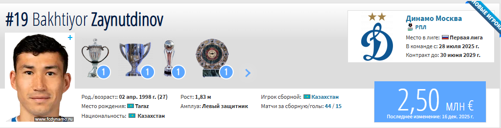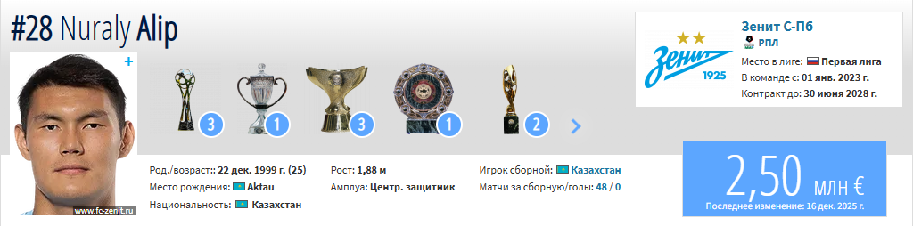 Таким образом, в рамках последнего обновления Transfermarkt его стоимость снизилась на 500 тысяч евро, что и привело к уравниванию цен с Нуралы Алипом и Максимом Самородовым.