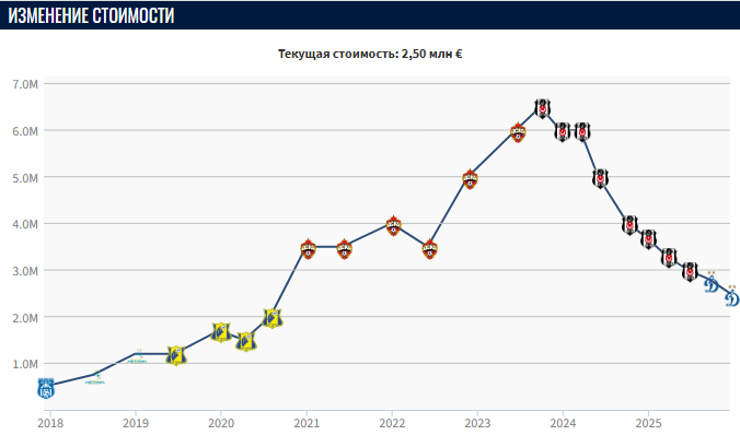 До последнего обновления и перехода в московское «Динамо» его рыночная стоимость составляла 3 миллиона евро.