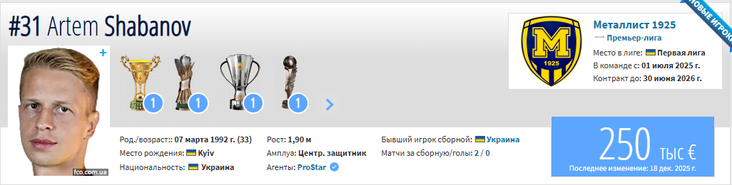 По информации ASnews.kz, оборонительную линию «Актобе» может усилить опытный украинский легионер Артем Шабанов. 33-летний защитник, имеющий в активе выступления за такие клубы, как киевское «Динамо», польская «Легия» и венгерский «Фехервар», вошел в трансферный шорт-лист казахстанского клуба. Стоимость его трансфера составяет 250 тысяч евро, или 150,4 млн тенге.