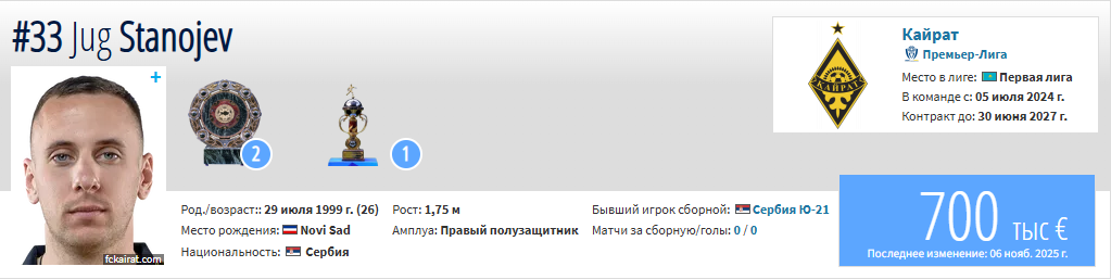 Юг Станоев завершает свои выступления за алматинский «Кайрат», передает Offside.kz.