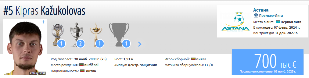 Кипрас Кажуколовас: защитник сборной Литвы с контрактом до 2027 года. Именно на его трансфере «Астана» может заработать рыночную компенсацию, так как долгосрочное соглашение позволяет диктовать условия покупателям.