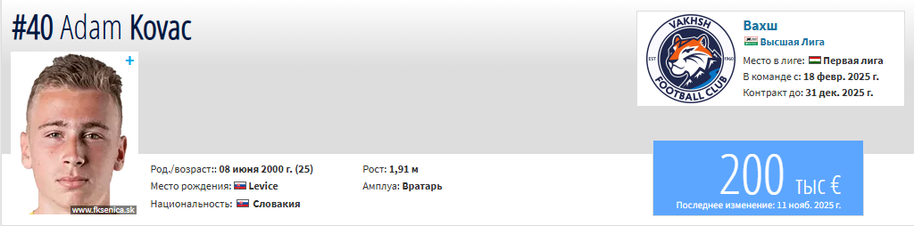 Адам Ковач переезжает в Казахстан в статусе действующего лучшего голкипера чемпионата Таджикистана. В минувшем сезоне, защищая цвета клуба «Вахш», словак продемонстрировал впечатляющую надежность: в 21 проведенном матче он пропустил лишь 17 мячей. Семь поединков вратарь завершил «на ноль», что стало ключевым фактором в признании его лучшим игроком своего амплуа по итогам турнира.