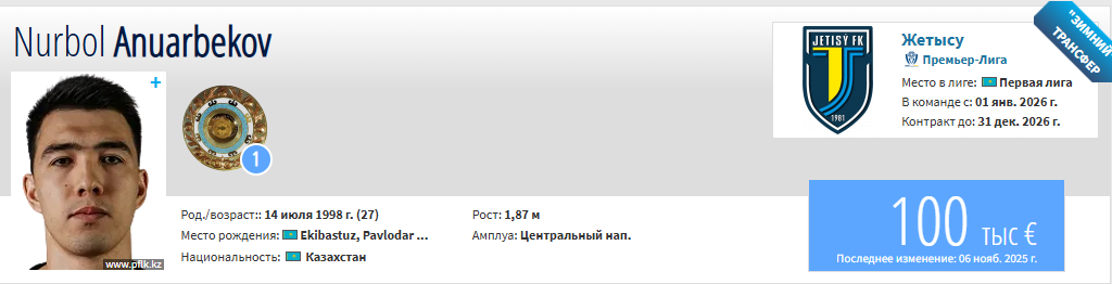 По данным авторитетного портала Transfermarkt, рыночная стоимость Нурбола Ануарбекова на данный момент оценивается в 100 тысяч евро.