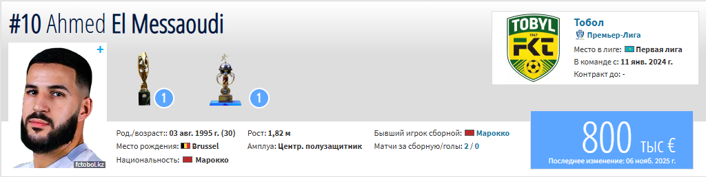 Напомним, что в сезоне КПЛ-2025 Эль-Мессауди был одним из лидеров костанайского «Тобола». В 22 проведенных матчах он продемонстрировал высокую результативность, забив 7 голов и оформив 6 ассистов. Вместе с «Тоболом» марокканец стал обладателем Кубка Казахстана и завоевал бронзовые медали чемпионата, подтвердив свой статус одного из самых эффективных легионеров лиги.