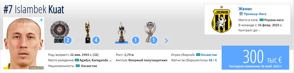 По данным AmanVibe, опытный полузащитник национальной сборной Казахстана Исламбек Куат максимально близок к тому, чтобы продлить трудовое соглашение с столичным ФК «Женис».