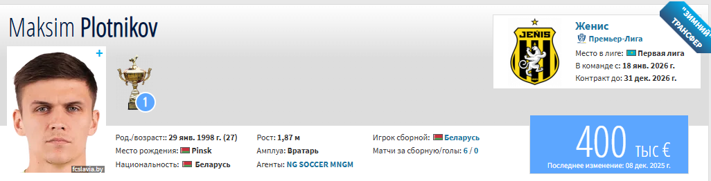 После ухода ганского голкипера Разака Абалоры руководство «Жениса» вышло с личным предложением к игроку «Славии». По данным Аladop.kz, на данный момент между клубом и Плотниковым достигнута устная договоренность. Тем не менее, портал Transfermarkt уже официально закрепил Максима Плотникова в качестве вратаря «Жениса».