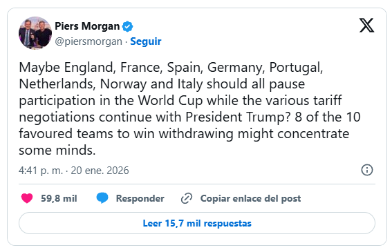 Позицию Германии поддержал известный журналист Пирс Морган, предложив лидерам европейского футбола (Англии, Франции, Испании, Италии и др.) коллективно сняться с ЧМ. По его мнению, отсутствие 8 из 10 главных фаворитов станет для Трампа и FIFA катастрофой, которую невозможно будет игнорировать.