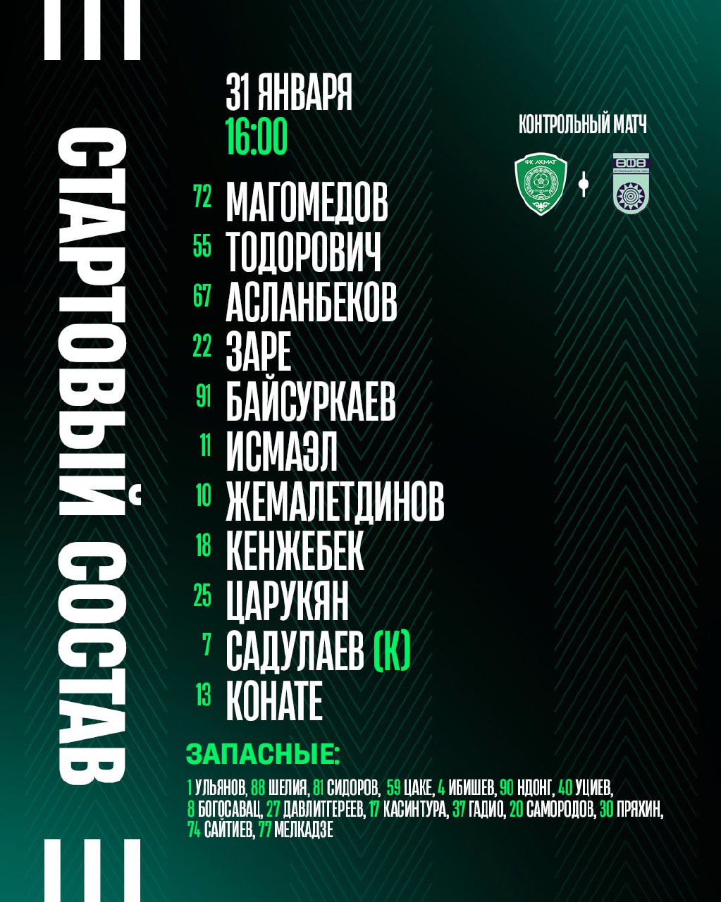 Главный тренер грозненского клуба Станислав Черчесов выбрал следующий стартовый состав: Магомедов, Тодорович, Асланбеков, Заре, Байсуркаев, Исмаэл, Жемалетдинов, Кенжебек, Царукян, Садулаев. Еще один казахстанский футболист «Ахмата», нападающий Макис Самородов, начнет встречу на скамейке запасных.