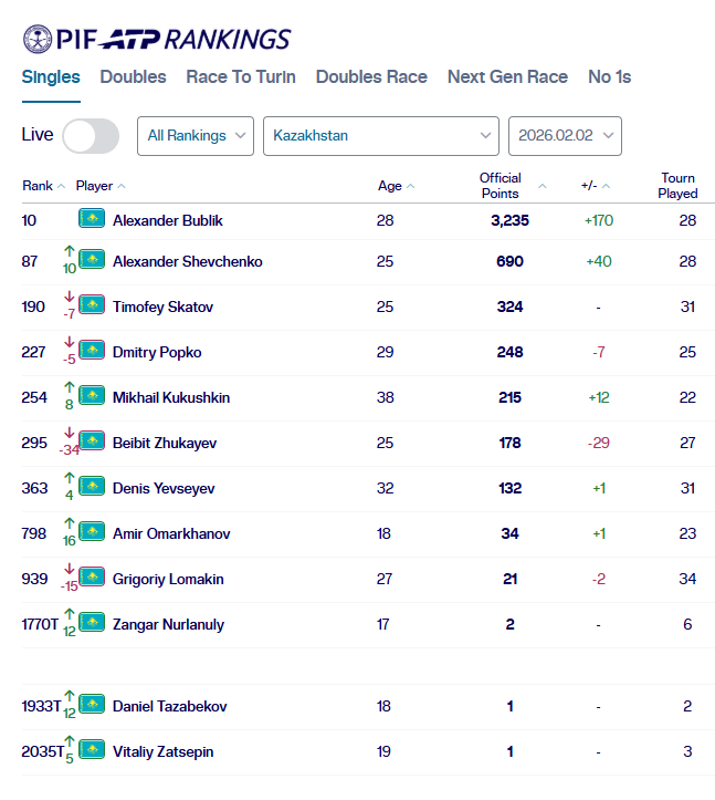 Ассоциация теннисистов-профессионалов опубликовала обновленную версию рейтингов спортсменов по итогам Australian Open 2026. В нем представлены 12 казахстанских теннисистов.