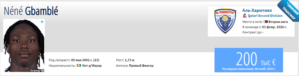 23-летний Нене Би Джуниор Гбамбле начал карьеру в украинском «Рубиконе», затем выступал за «Ахмат», где дебютировал в РПЛ и забил первый гол, а также за московское «Торпедо» и «Шинник». С февраля 2025 года играет в чемпионате Казахстана.