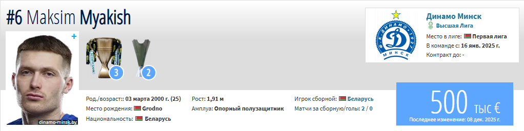 25-летний Максим Мякиш – белорусский футболист, полузащитник минского «Динамо» и сборной Беларуси. Воспитанник гродненского «Немана». Клубная карьера: «Неман» (2017), «Униан Лейрия» (2018), БАТЭ (2019–2022), «Славия-Мозырь» и «Ислочь» (аренда), «Торпедо-БелАЗ» (2022–2024), с 2025 года – «Динамо» (Минск).