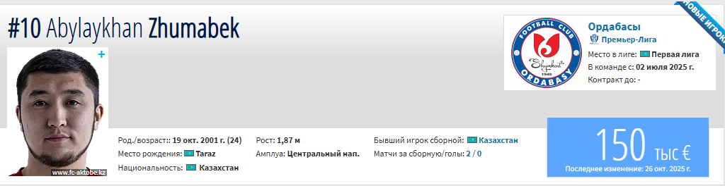 Казахстанский нападающий Абылайхан Жумабек стал игроком «Атырау». Детали контракта не разглашаются, футболист ранее выступал за «Ордабасы» и другие клубы КПЛ.