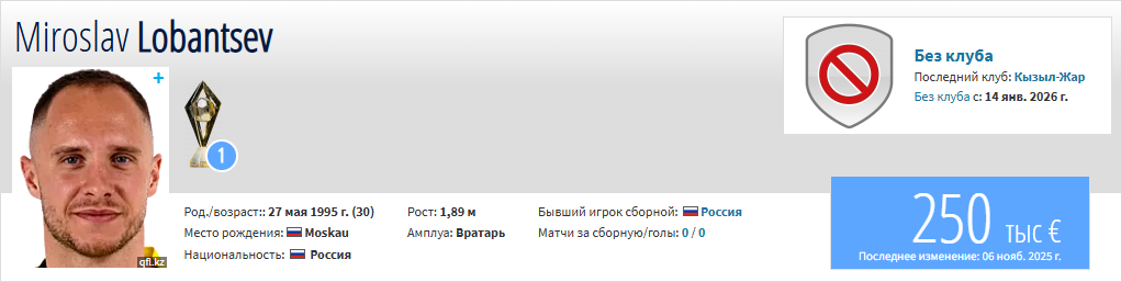 Российский вратарь Мирослав Лобанцев подписал контракт с «Окжетпесом», сообщает Sports24.kz.