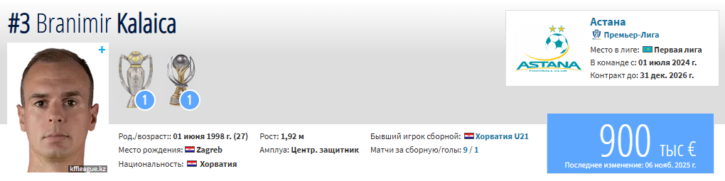 Хорватский защитник Бранимир Калаица выступает за «Астану» с 2024 года. Контракт действует до конца 2026 года. В 2025 году забил несколько голов, в том числе в матчах против «Жениса», «Витории Гимарайнш», «Атырау» и «Боавишты».