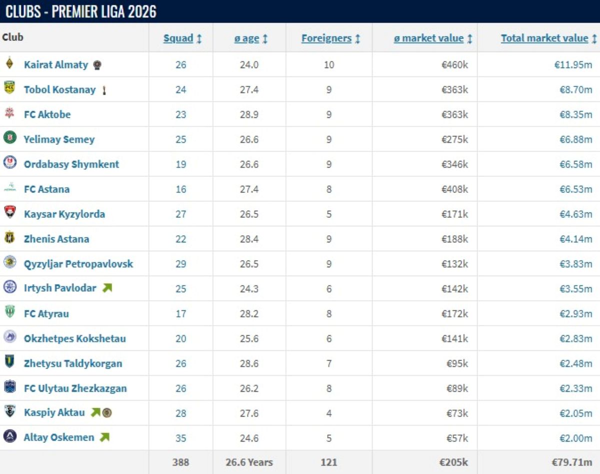 Перед началом сезона Казахстанской Премьер-лиги-2026 разница в рыночной стоимости составов между лидерами и аутсайдерами превышает 9 млн евро.