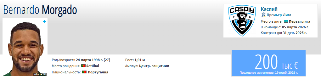 Португальский 27-лений центральный защитник Бернарду Моргадо стал игроком актауского клуба «Каспий».