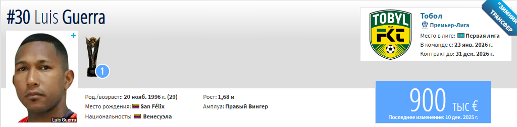 Герра открыл счет в победном матче против «Кайрата» (5:4 по пенальти). Для венесуэльца это первый опыт игры за пределами Латинской Америки; до этого он выступал за чилийский «Лимаче». Ранее 29-летний фланговый нападающий не играл за сборную Венесуэлы, чей состав оценивается в 72,35 млн евро.