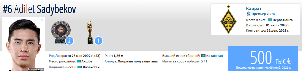 По информации телеграм-канала AmanVibe, «Кайрат» не согласовал аренду Адилета Садыбекова в другие клубы КПЛ.